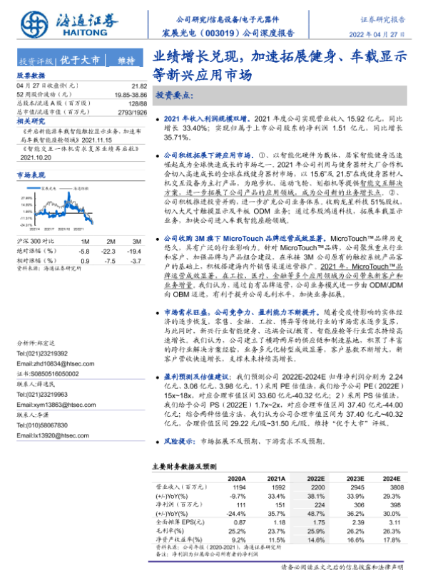 【海通证券】【20220427】20220427-海通证券-宸展光电-003019.SZ-公司深度报告:业绩增长兑现,加速拓展健身、车载显示等新兴应用市场-21页 行业研究