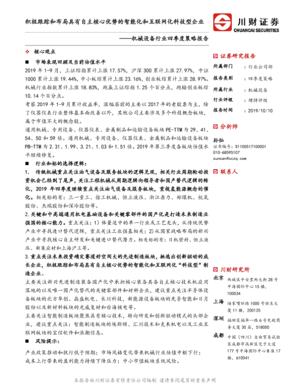 【川财证券】【20191010】机械设备行业四季度策略报告:积极跟踪和布局具有自主核心优势的智能化和互联网化科技型企业-15页 行业研究