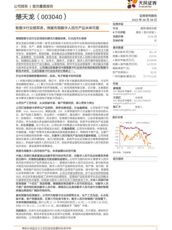 【天风证券】【20220608】20220608-天风证券-楚天龙-003040.SZ-智能卡行业领军者,深度布局数字人民币产品未来可期-45页 行业研究