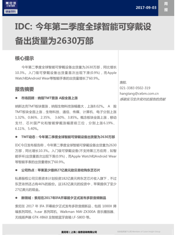 【莫尼塔研究】【20170903】2017年09月03日更新-莫尼塔投资-TMT行业周报:IDC:今年第二季度全球智能可穿戴设备出货量为2630万部-7页 行业研究