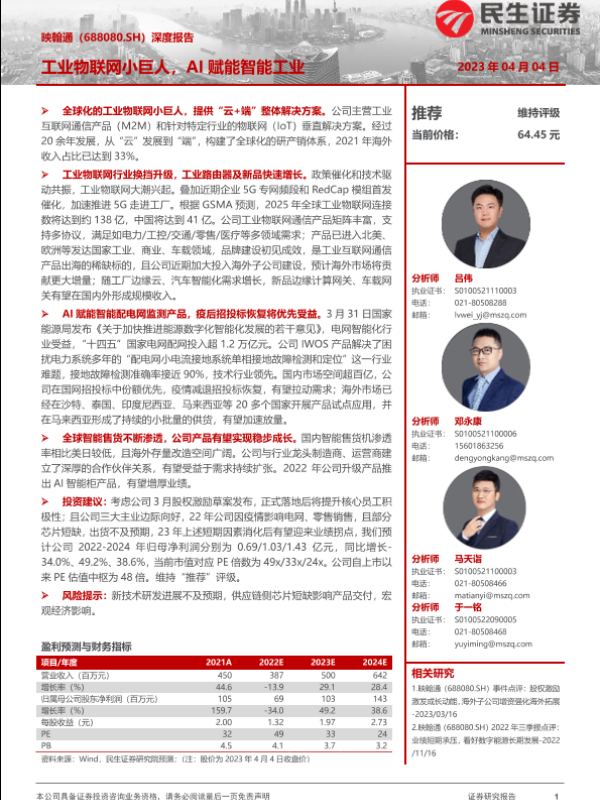 【民生证券】【20230404】映翰通深度报告(688080):工业物联网小巨人,AI赋能智能工业-28页 行业研究
