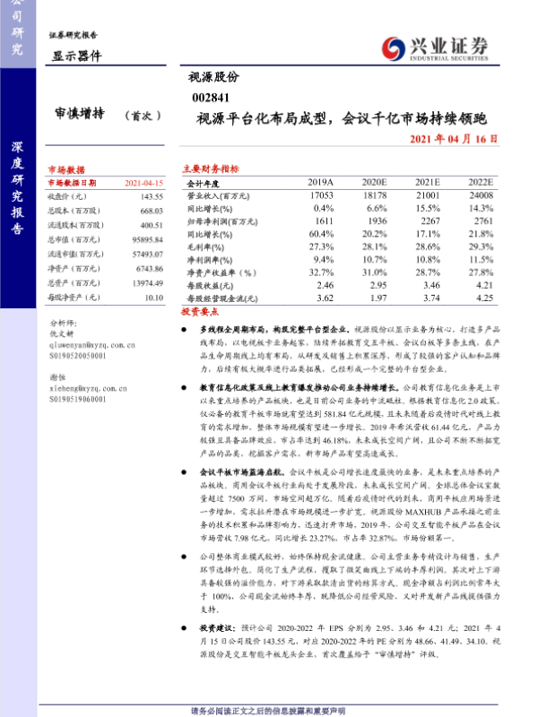 【兴业证券】【20210416】视源平台化布局成型,会议千亿市场持续领跑-39页 行业研究