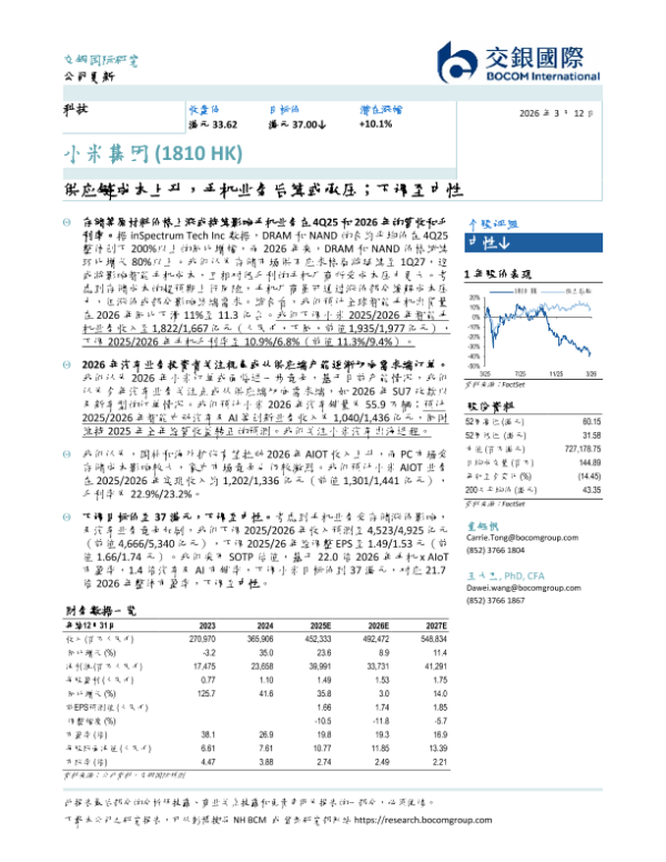 【交银国际】【202603】供应链成本上升,手机业务后续或承压;下调至中性-7页 证券期货研究报告