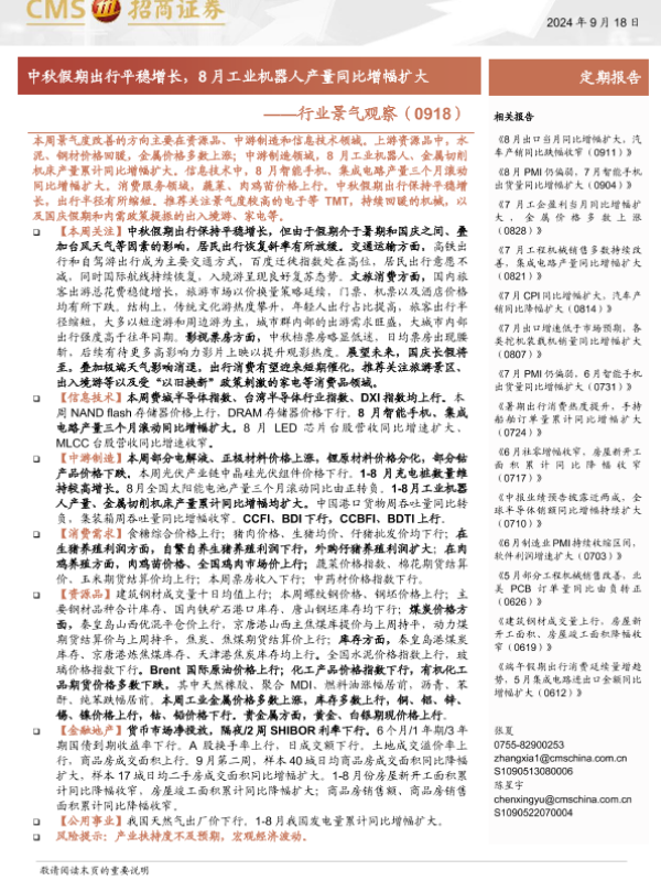 【海通证券】【20240918】行业景气观察:中秋假期出行平稳增长,8月工业机器人产量同比增幅扩大-36页 行业研究