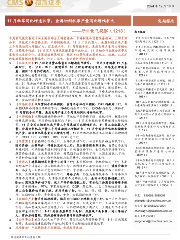 【海通证券】【20241218】行业景气观察(1218):11月社零同比增速收窄,金属切削机床产量同比增幅扩大-36页 行业研究