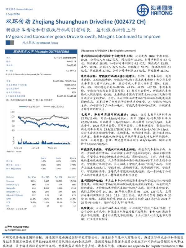 【海通国际】【20240903】双环传动(002472)新能源车齿轮和智能执行机构引领增长,盈利能力持续上行-12页 行业研究
