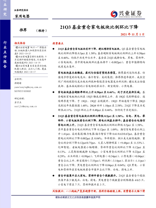 【兴业证券】【20211101】21Q3基金重仓家电板块比例环比下降-13页 行业研究
