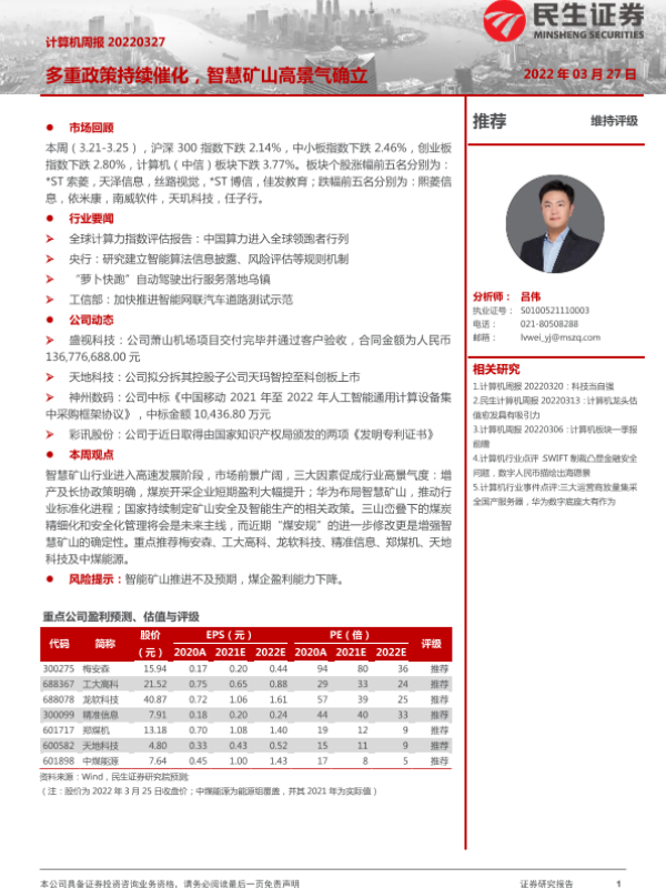 【民生证券】【20220327】计算机周报:多重政策持续催化,智慧矿山高景气确立-21页 行业研究
