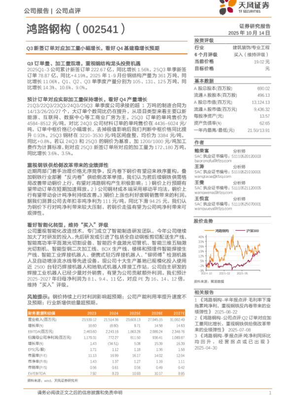 【天风证券】【202510】鸿路钢构-公司点评 Q3新签订单对应加工量小幅增长,看好Q4基建稳增长预期-4页 证券期货研究报告