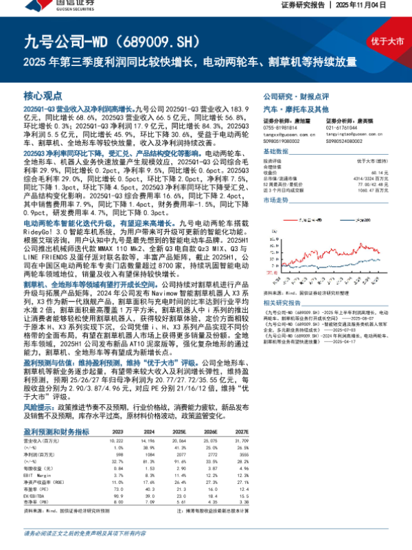 【国信证券】【202511】2025年第三季度利润同比较快增长,电动两轮车、割草机等持续放量-10页 证券期货研究报告