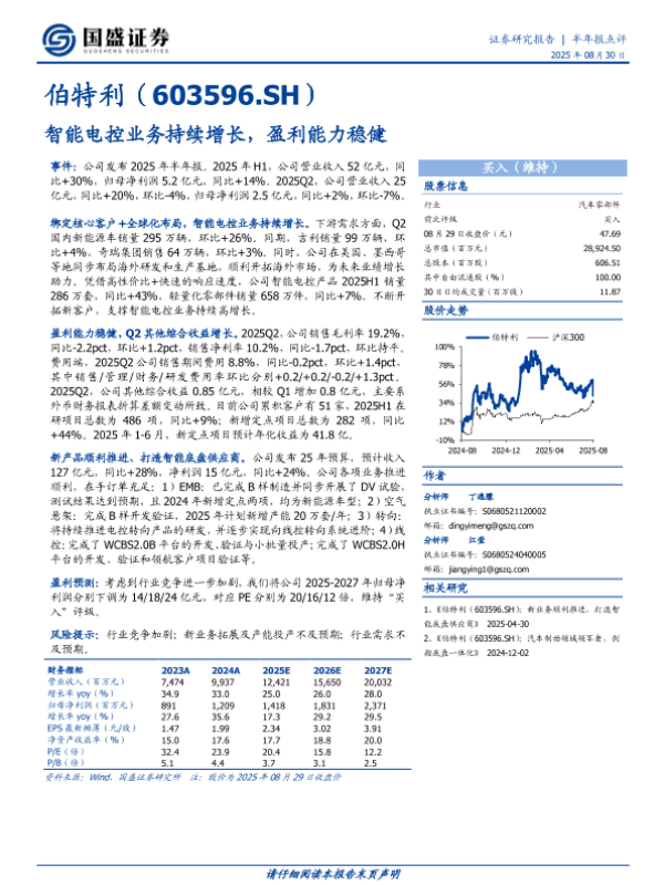 【国信证券】【202509】优于大市 伯特利(603596.SH)上半年收入同比增长 32%,公司海外业务加速-10页 证券期货研究报告