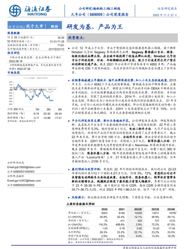 【海通证券】【20221127】九号公司-689009.SH-公司深度报告:研发为基,产品为王-42页 行业研究