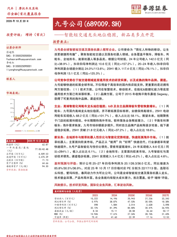 【华源证券】【202510】九号公司(689009.SH)——智能短交通龙头地位稳固,新品类多点开花-3页 证券期货研究报告