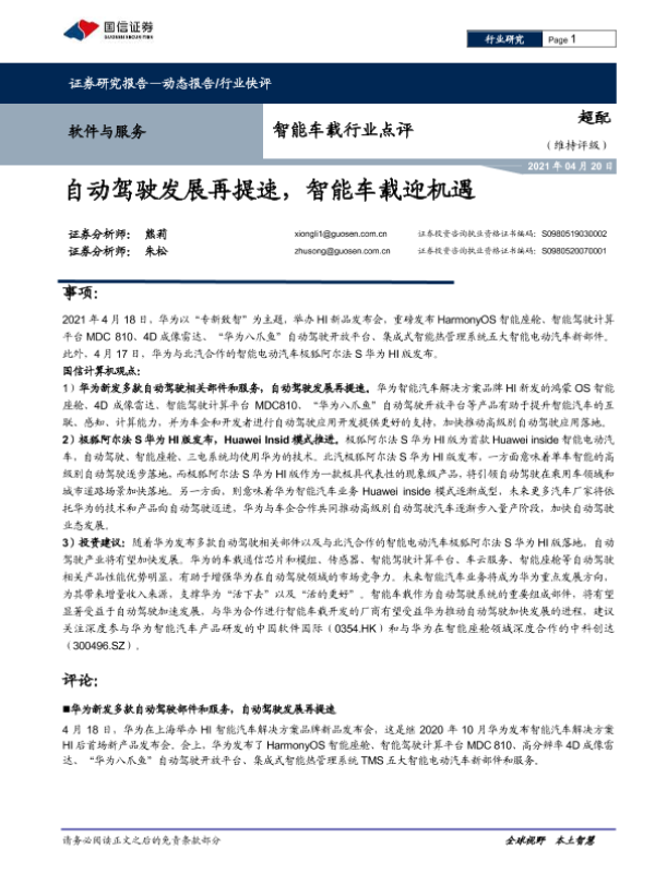 【国信证券】【20210420】智能车载行业点评:自动驾驶发展再提速,智能车载迎机遇-9页 行业研究