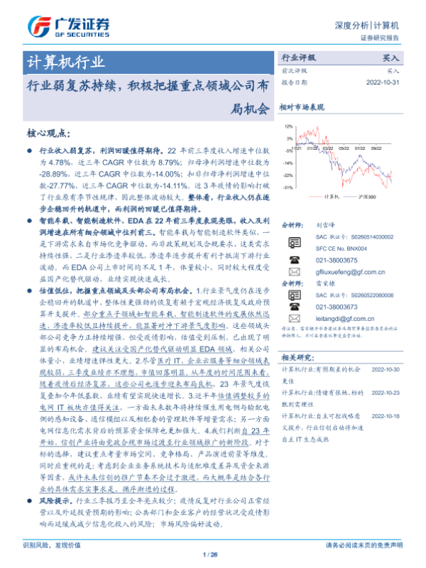 【广发证券】【20221031】计算机行业深度分析:行业弱复苏持续,积极把握重点领域公司布局机会-26页 行业研究