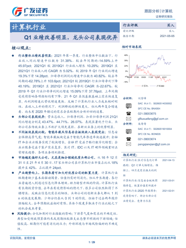 【广发证券】【20210505】计算机行业:Q1业绩改善明显,龙头公司表现优异-29页 行业研究