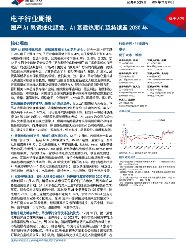 【国信证券】【20241223】20241223-国信证券-电子行业周报:国产AI眼镜催化频发,AI基建热潮有望持续至2030年-10页 行业研究