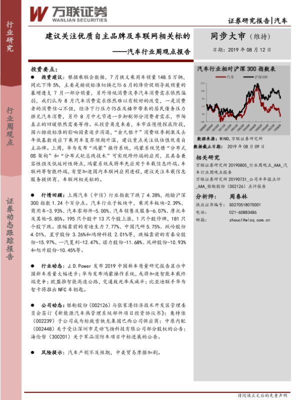 【万联证券】【20190812】20190812-万联证券-汽车行业周观点报告:建议关注优质自主品牌及车联网相关标的-13页 行业研究