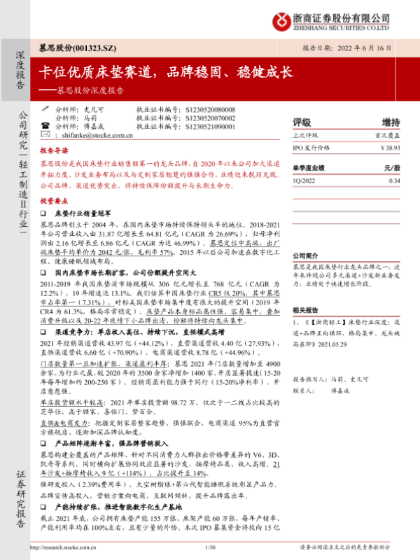 【浙商证券】【20220616】慕思股份深度报告:卡位优质床垫赛道,品牌稳固、稳健成长-30页 行业研究