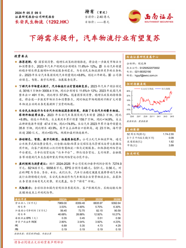 【西南证券】【20240509】长安民生物流(1292.HK)下游需求提升,汽车物流行业有望复苏-32页 行业研究
