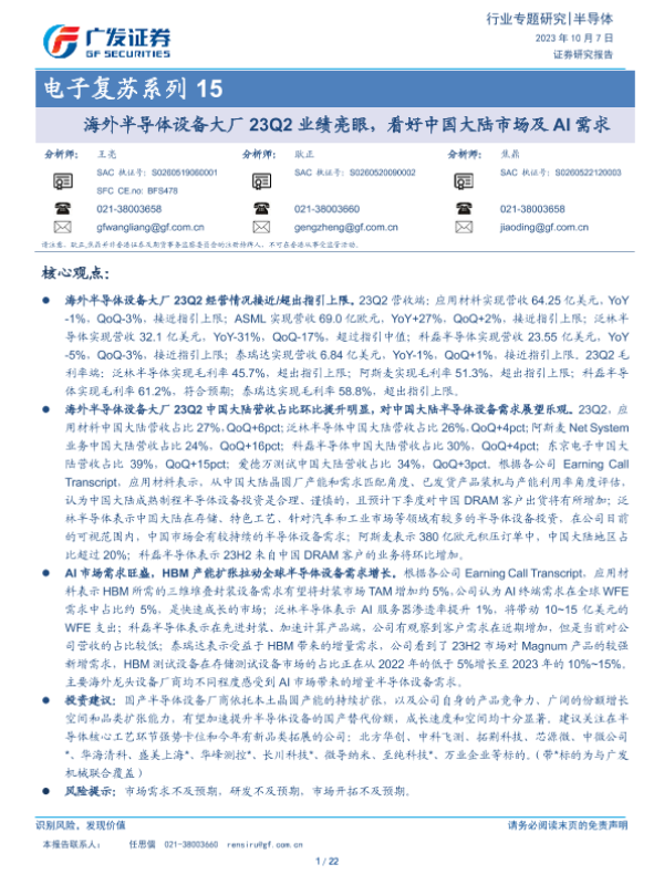 【广发证券】【20231007】电子复苏系列15:海外半导体设备大厂23Q2业绩亮眼,看好中国大陆市场及AI需求-22页 行业研究