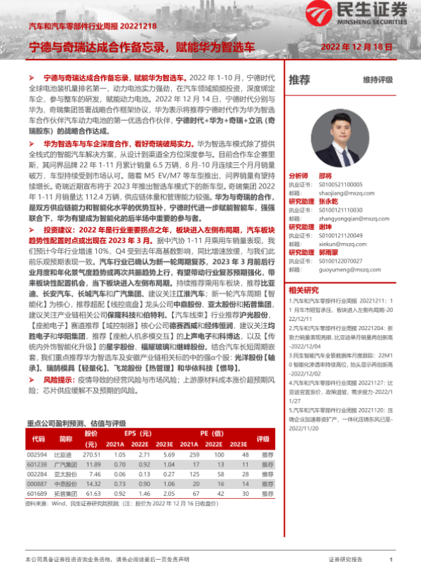 【民生证券】【20221218】汽车和汽车零部件行业周报:宁德与奇瑞达成合作备忘录,赋能华为智选车-20页 行业研究