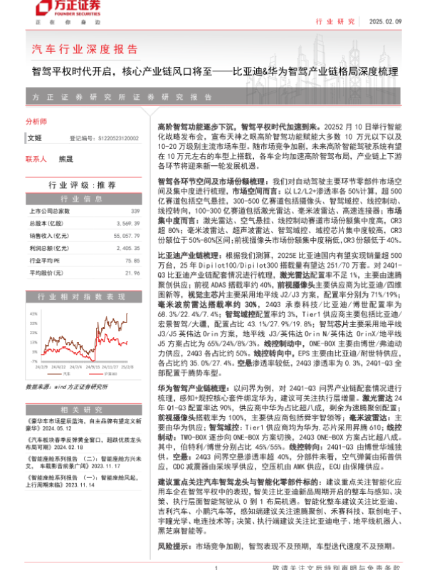 【方正证券】【20250209】汽车行业深度报告:智驾平权时代开启,核心产业链风口将至——比亚迪&华为智驾产业链格局深度梳理-26页 行业研究