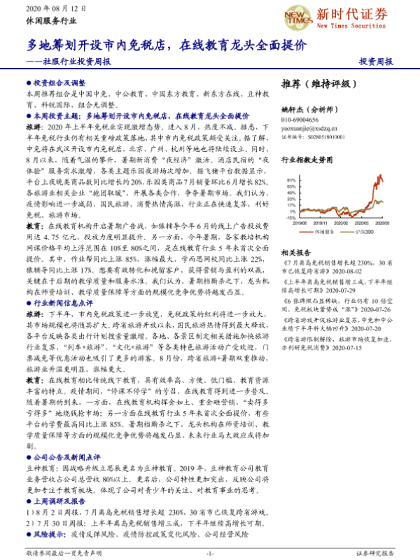 【新时代证券】【20200812】社服行业投资周报:多地筹划开设市内免税店,在线教育龙头全面提价-18页 行业研究
