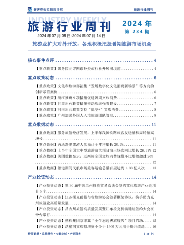 【智研咨询监测项目部】【202407】旅游行业周刊:旅游业扩大对外开放,各地积极把握暑期旅游市场机会-34页 行业研究