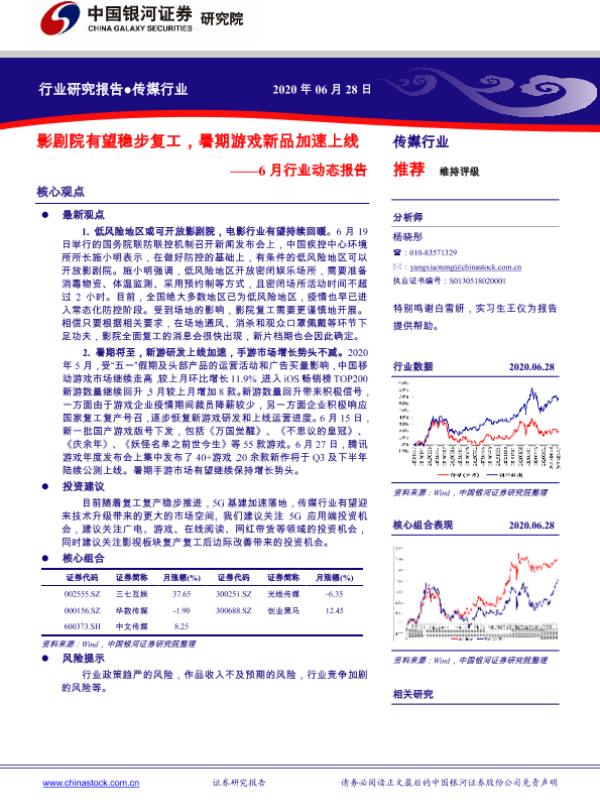 【银河证券】【20200628】20200628-中国银河-传媒行业6月行业动态报告:影剧院有望稳步复工,暑期游戏新品加速上线-73页 行业研究