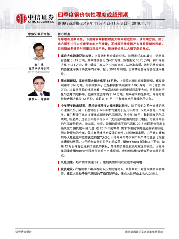 【中信证券】【20191111】钢铁行业周报:四季度钢价韧性程度或超预期-13页 行业研究