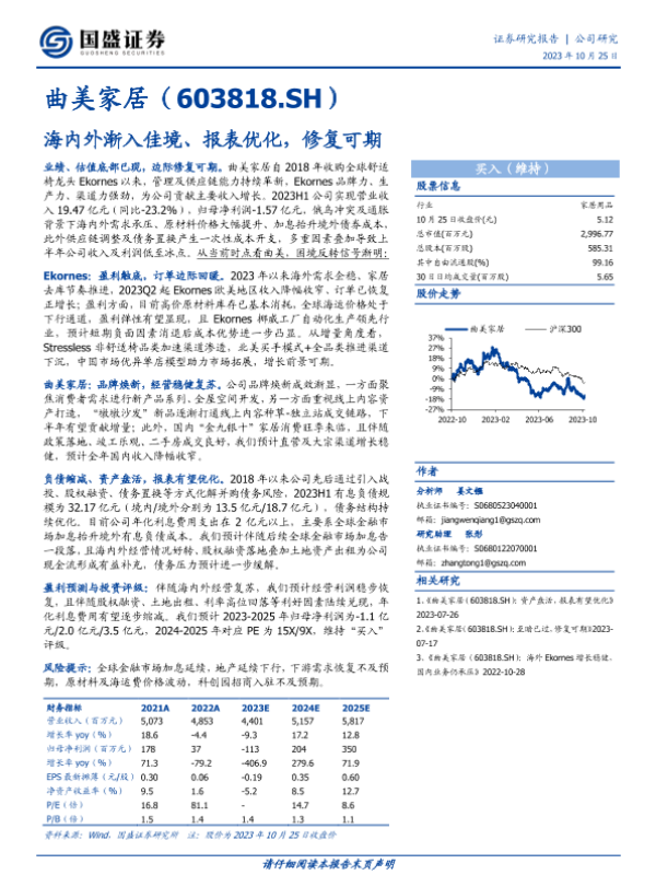 【国盛证券】【20231025】曲美家居-603818.SH-海内外渐入佳境、报表优化,修复可期-24页 行业研究