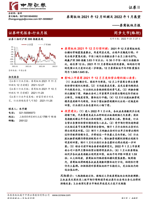 【中原证券】【20220127】券商板块2021年12月回顾及2022年1月展望-8页 行业研究