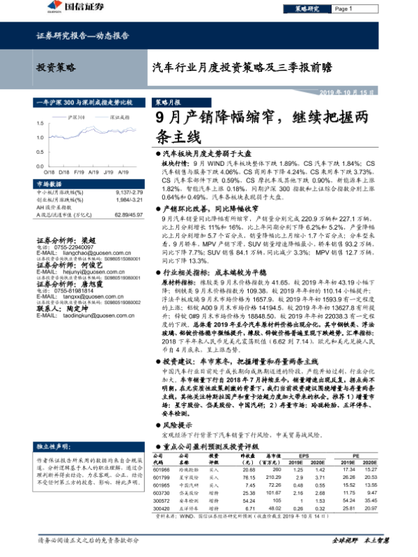 【国信证券】【20191015】20191015-国信证券-汽车行业月度投资策略及三季报前瞻:9月产销降幅缩窄,继续把握两条主线-28页 行业研究