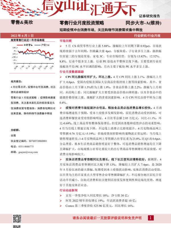 【山西证券】【20220601】零售行业月度投资策略:短期疫情冲击消费市场,关注购物节消费需求集中释放-17页 行业研究