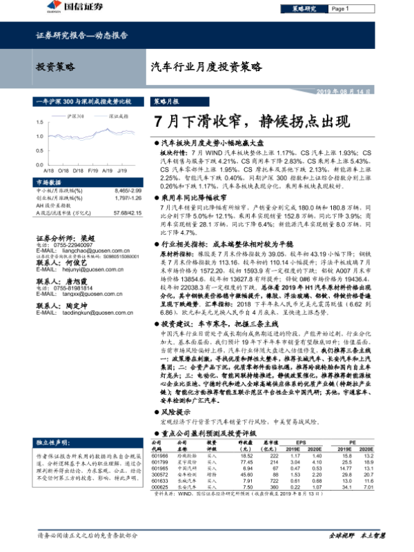 【国信证券】【20190814】汽车行业月度投资策略:7月下滑收窄,静候拐点出现-22页 行业研究