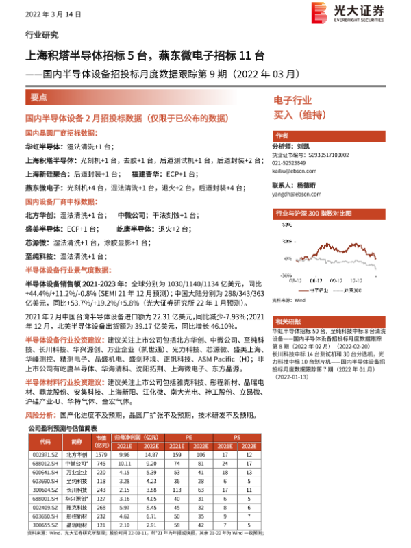 【光大证券】【20220314】国内半导体设备招投标月度数据跟踪第9期(2022年03月):上海积塔半导体招标5台,燕东微电子招标11台-20页 行业研究
