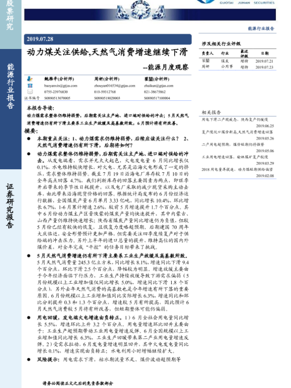 【国泰君安证券】【20190728】20190728-国泰君安-能源月度观察:动力煤关注供给,天然气消费增速继续下滑-19页 行业研究