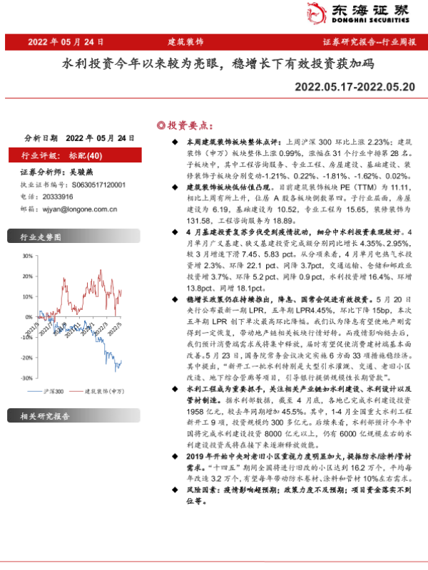 【东海证券】【20220524】建筑装饰行业周报:水利投资今年以来较为亮眼,稳增长下有效投资获加码-11页 行业研究