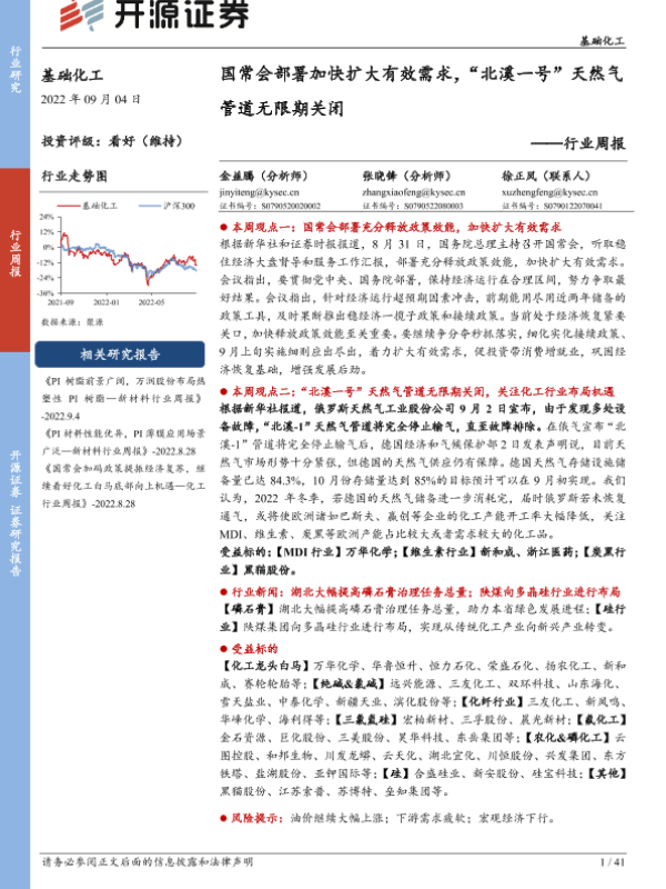 【开源证券】【20220904】基础化工行业周报:国常会部署加快扩大有效需求,“北溪一号”天然气管道无限期关闭-41页 行业研究