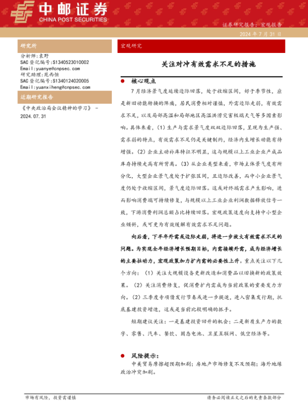【中邮证券】【20240731】关注对冲有效需求不足的措施-12页 行业研究