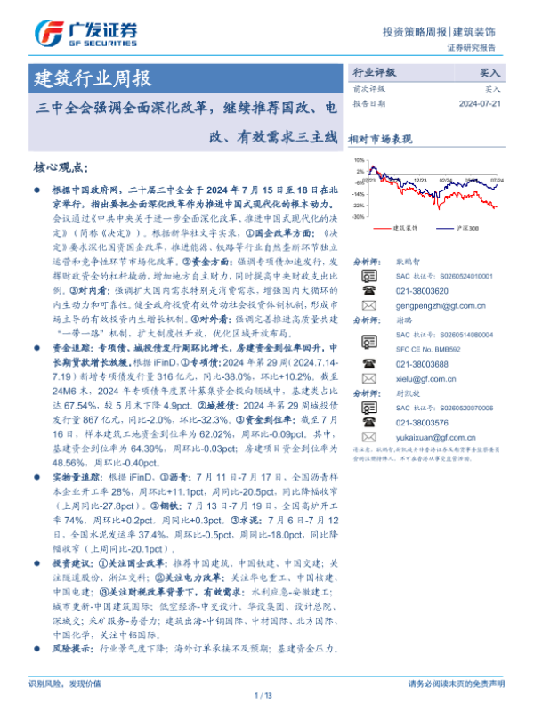 【广发证券】【20240721】建筑行业周报:三中全会强调全面深化改革,继续推荐国改、电改、有效需求三主线-13页 行业研究