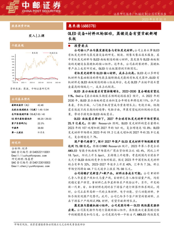 【中邮证券】【20230831】奥来德(688378)OLED设备+材料双轮驱动,蒸镀设备有望贡献新增长极-28页 行业研究