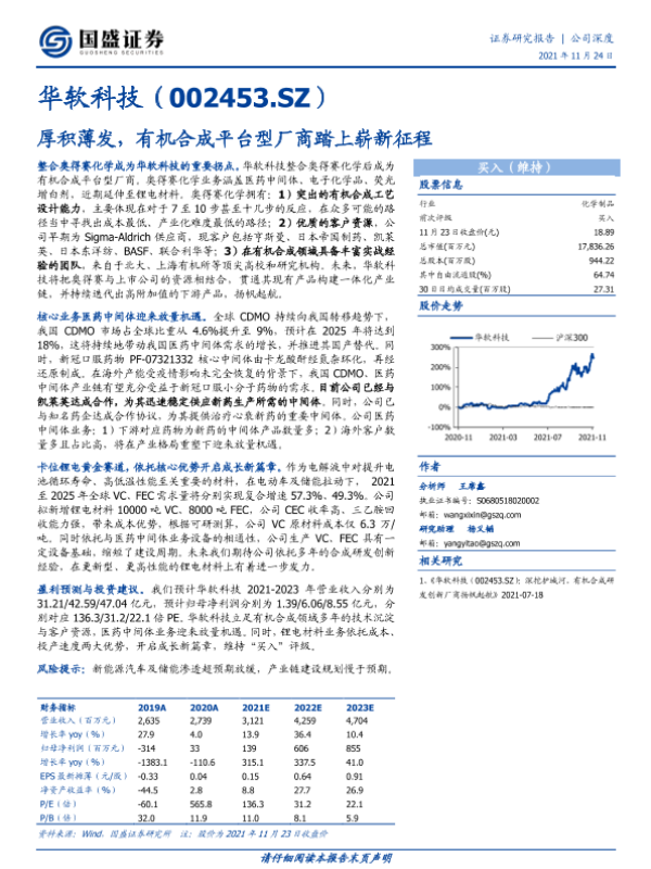 【国盛证券】【20211124】华软科技(002453.SZ)厚积薄发,有机合成平台型厂商踏上崭新征程-16页 行业研究