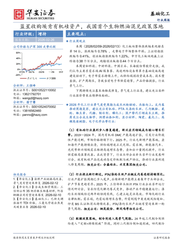 【华安证券】【202603】2026年03月09日更新-【华安化工】基础化工:蓝星收购埃肯有机硅资产,我国首个生物燃油混兑政策落地-32页 行业研究