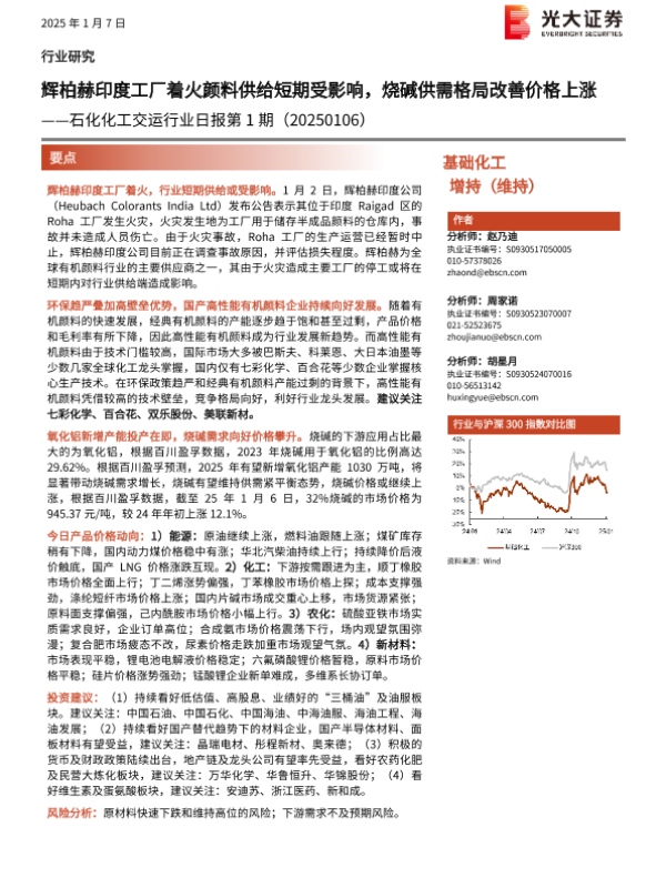 【光大证券】【20250107】石化化工交运行业日报第1期:辉柏赫印度工厂着火颜料供给短期受影响,烧碱供需格局改善价格上涨-11页 行业研究