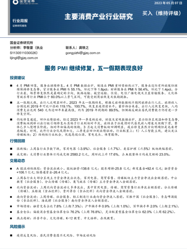 【国金证券】【20230507】主要消费产业行业周报:服务PMI继续修复,五一假期表现良好-16页 行业研究