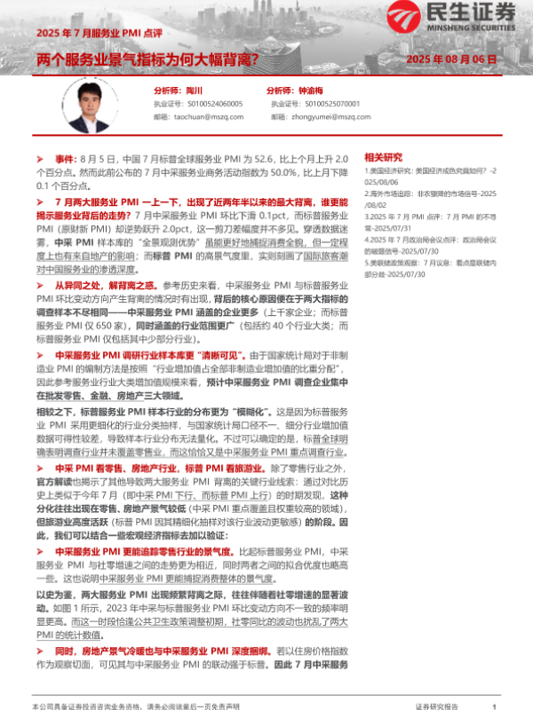 【民生证券】【20250806】2025年7月服务业PMI点评:两个服务业景气指标为何大幅背离?-8页 证券期货研究报告