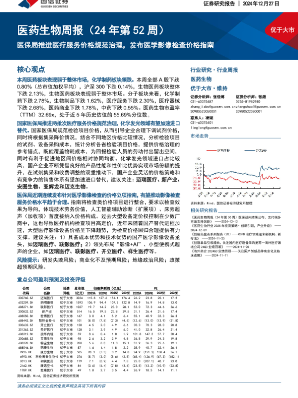 【国信证券】【20241227】医药生物行业周报:医保局推进医疗服务价格规范治理,发布医学影像检查价格指南-20页 行业研究