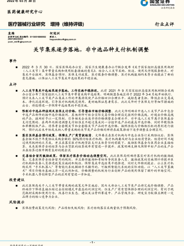 【国金证券】【20220330】关节集采逐步落地,非中选品种支付机制调整-3页 行业研究